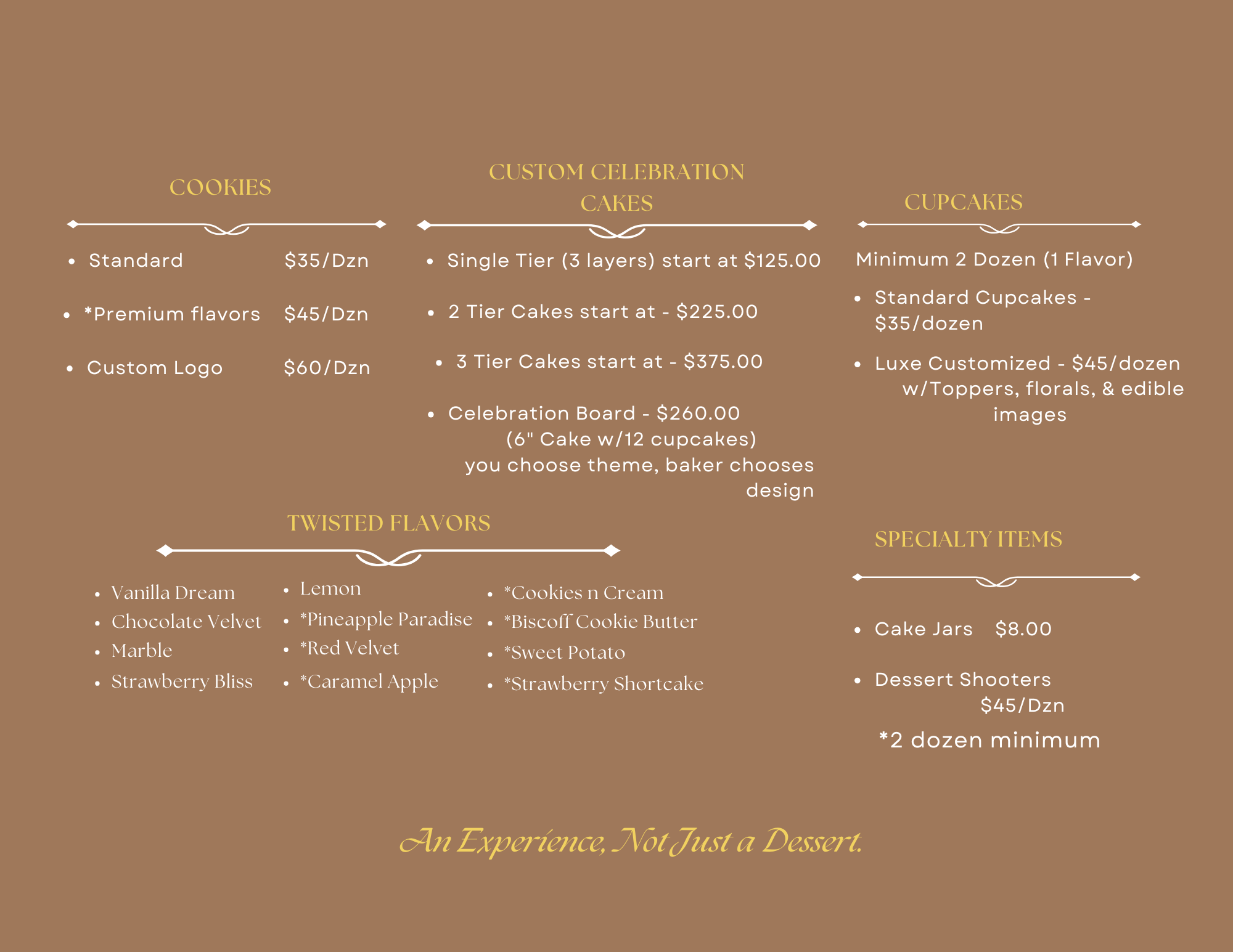 At Mz. Rita’s Twisted Desserts, we believe every dessert should be as memorable as the moment it celebrates. Known for our trusted flavor and signature creativity, we craft desserts that bring joy, elegance, and personality to every occasion. From rich southern- inspired classics to modern favorites with a twist, every treat is made with care, passion, and premium ingredients.
